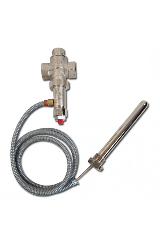 Vermijdt oververhitting van ketels gestookt met vaste brandstoffen (kolen, hout,…). Test drukknop, 2 voelers. Huis in verchroomd messing. Voeler kabel 1300 mm, dompelvoeler 145 mm – 1/2’’ M. 3/4" aansluiting.